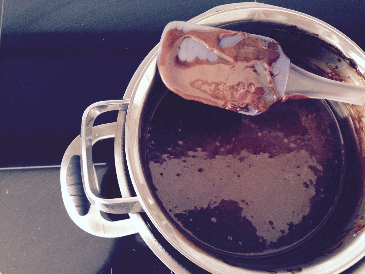 Calentamos al baño maría el chocolate troceado, las nubes y la leche, removiendo constantemente con la ayuda de una espátula y a fuego lento para que no se queme el chocolate. Cuando este todo fundido e integrado, reservamos y dejamos enfriar.