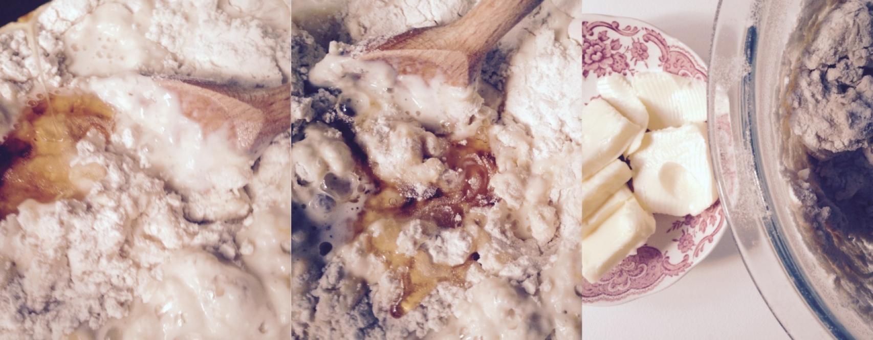 Para empezar, en un bol grande tamizamos la levadura con la harina, a continuación incorporamos el huevo, la leche, el azúcar, la miel y la sal. Mezclamos todo bien de forma manual con una cuchara o con el gancho de vuestra batidora o robot de cocina, a velocidad baja.