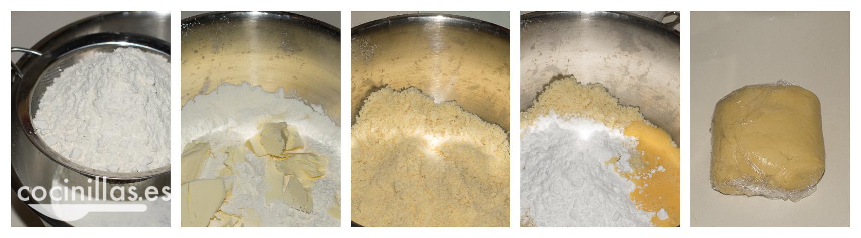 Empezamos tamizando la harina con un colador o tamizador. A continuación, añadimos la mantequilla en dados que debe estar muy fría. La amasamos a mano o con un procesador de alimentos lo suficiente para que se integre con la harina y forme una especie de arenilla. Cuidado, no amaséis en exceso ni aportéis demasiado calor mientras mezcláis. Una vez la textura está bien granulada y fina -como si fuese arena-, agregamos el azúcar glas y el huevo. Amasamos lo justo para que se forme una bola (no más ya que no requiere de un amasado extenso). Envolvemos con papel film y reservamos en la nevera por 1 hora ya que sino no podríamos extenderla bien.