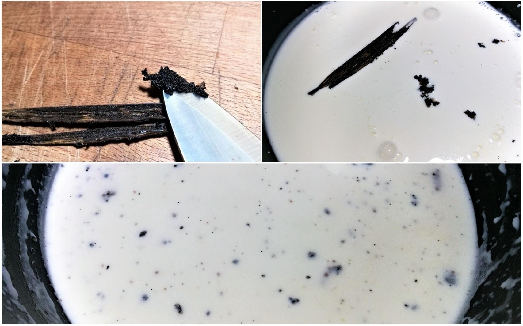 Juntamos la nata y la leche en un cazo y calentamos. Abrimos la vaina de vainilla,rescatamos los granos y los echamos también al cazo junto con la vaina.