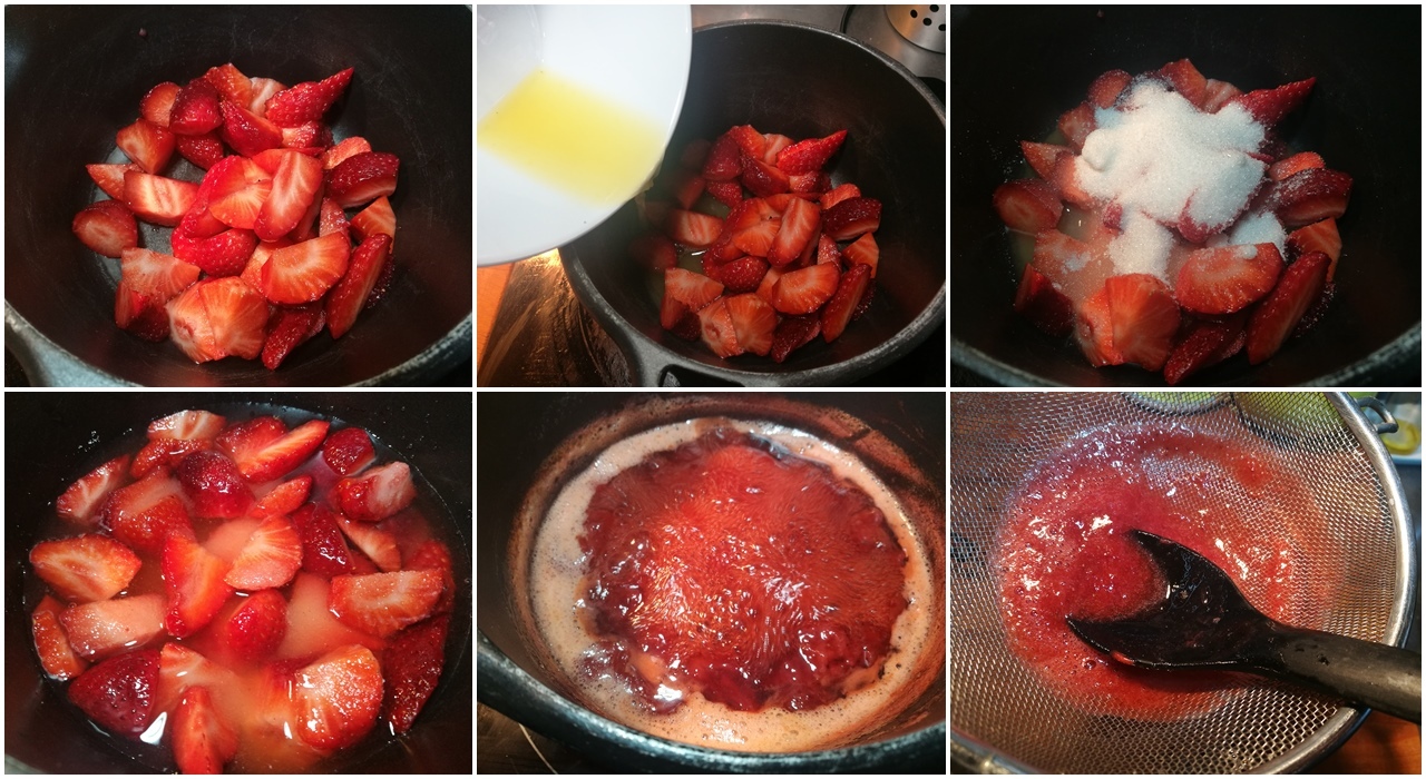 Troceamos las fresas en trozos irregulares y las añadimos al interior de un cazo. Añadimos tanto el zumo de limón como el zumo de naranja y el azúcar al mismo. Removemos bien las fresas con el resto de ingredientes y ponemos a un fuego bastante suave. Una vez arranque a hervir la preparación, añadimos el agua y cocemos a fuego lento unos 15 minutos.