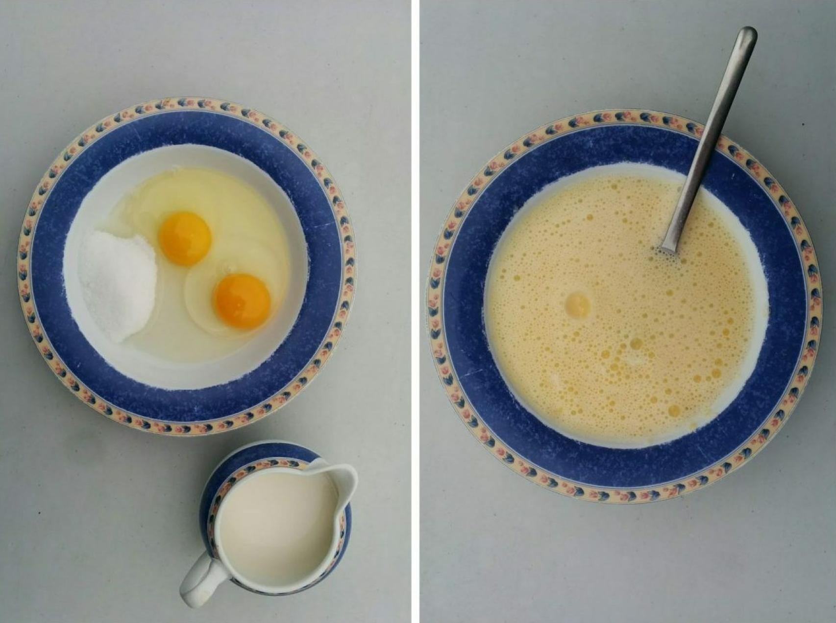 En un plato sopero batimos con un tenedor los huevos con el azúcar, añadimos la leche y mezclamos batiendo enérgicamente hasta que los huevos formen espuma, tal como se ve en la foto.
