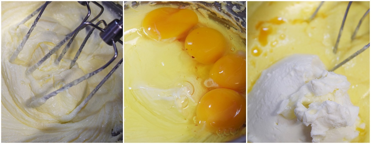 En un cuenco grande batimos la mantequilla y el azúcar hasta que blanquee. A continuación añadimos los huevos, batiendo bien. Vamos a añadir ahora la ralladura de naranja, después la cortamos, la exprimimos y añadimos a la masa unos 30 ml. Incorporamos el queso y batimos bien hasta que quede una masa lisa y sin grumos.