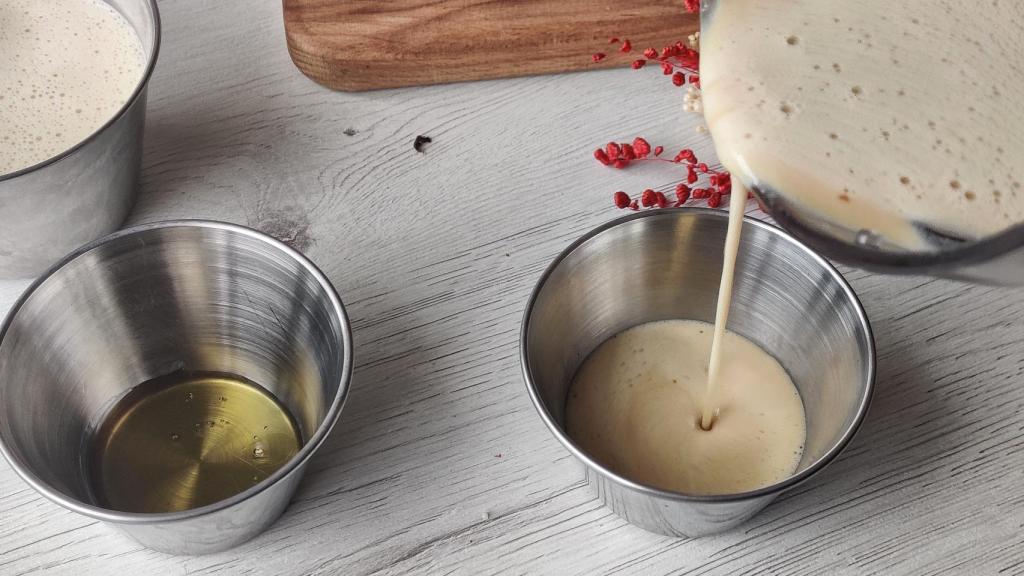 Añadir una cucharadita de miel en cada uno de los moldes, mover bien para que haya una capa por casi toda la flanera y, posteriormente, llenar con la mezcla del flan de turrón.