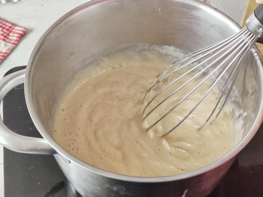 Calentar a fuego suave-medio sin dejar de remover, para que no se haga tortilla pero sí que se cuaje y coja consistencia. Una vez que ya tenga textura de natillas volcar en un recipiente, filmar a contacto y dejar enfriar completamente.