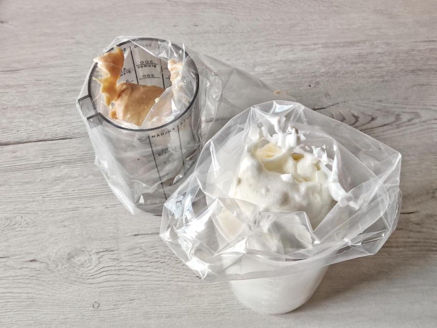 Montar la nata, que tiene que estar bien fría, con el azúcar glas y la ayuda de unas varillas. Cuidado con no batir demasiado porque si nos pasamos se hará mantequilla. Tendremos que batir hasta que esté muy firme.