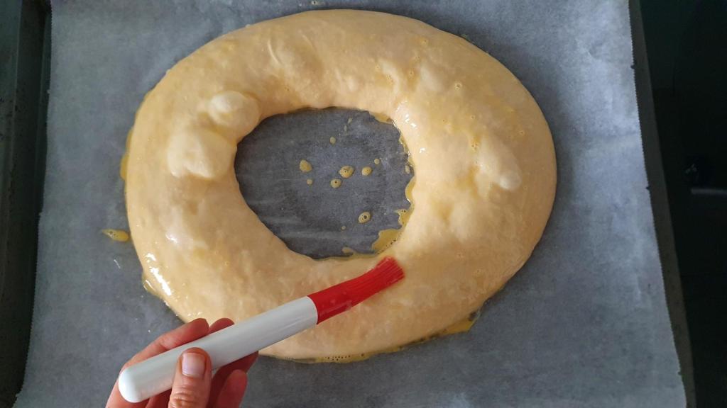 Volcar la masa a una superficie aceitada, formar una bola con tensión y meter los dedos en el centro para hacer la forma de la corona. Con delicadeza. Poner en el centro si se quiere un aro para que se respete la forma. El aro tiene que ser siempre aceitado previamente. Tapar con papel film y dejar fermentar de nuevo 2 horas más. Que crezca.