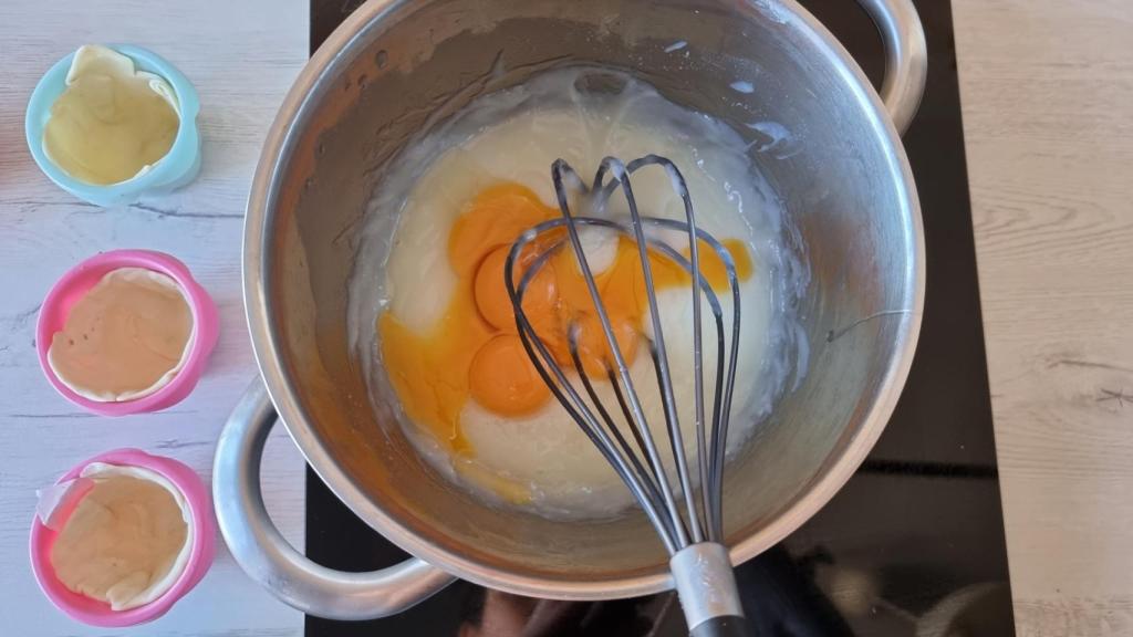 Añadir las yemas a la mezcla de la leche ya fría y mezclar bien. Incorporar también el almíbar y hacer lo mismo. Mezclaremos lo justo para que se junte todo pero que no espume.