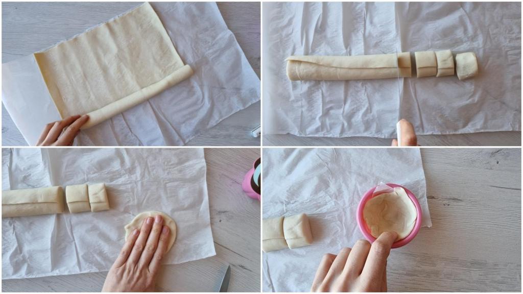 Extender la masa de hojaldre, salpicarla ligeramente con unas gotas de agua para que pegue bien y enrollar bien apretada sobre sí misma. Cortar piezas de unos tres centímetros de grosor y extender cada una con la ayuda de un rodillo y con los dedos. Poner cada pieza en el molde para hacer la base, lo mejor posible y hasta arriba.