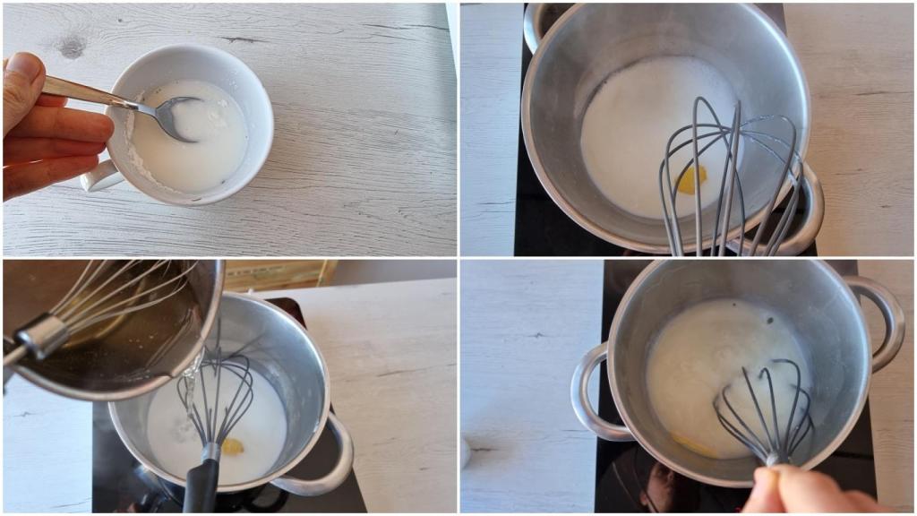 Disolver la harina en un poco de la leche y poner el resto de la leche en la olla hasta que hierva, con la canela y la piel de limón. Cuando rompa a hervir incorporar la mezcla de harina y leche y cocinar a fuego suave sin parar de remover con unas varillas hasta que la mezcla espese bien. Retirar la canela y el limón. Enfriar completamente.