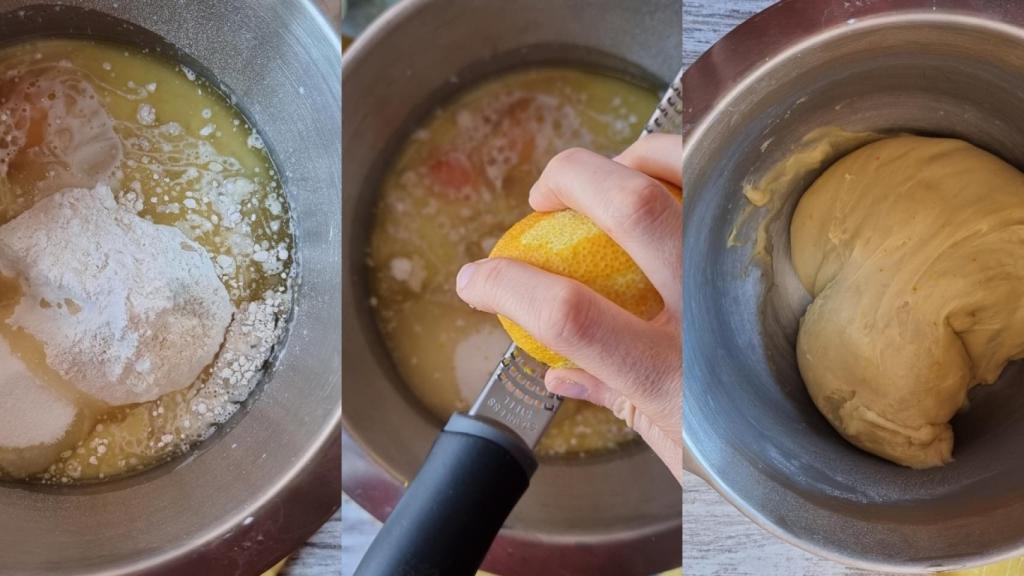 Poner todos los ingredientes en un mismo bol, integrar y amasar hasta que se forme una mezcla homogénea. Lo ideal es hacerlo en intervalos de un minuto, con reposos de cinco, hasta que quede una masa fina y homogeneizada. Si no lo hacéis con amasadora os recomiendo hacer un volcán con la harina, poner todos los ingredientes en su interior e ir incorporándolos poco a poco desde dentro hacia fuera para que la harina vaya absorbiendo poco a poco. Cuando la masa sea manejable sacar a una superficie y amasar a conciencia.