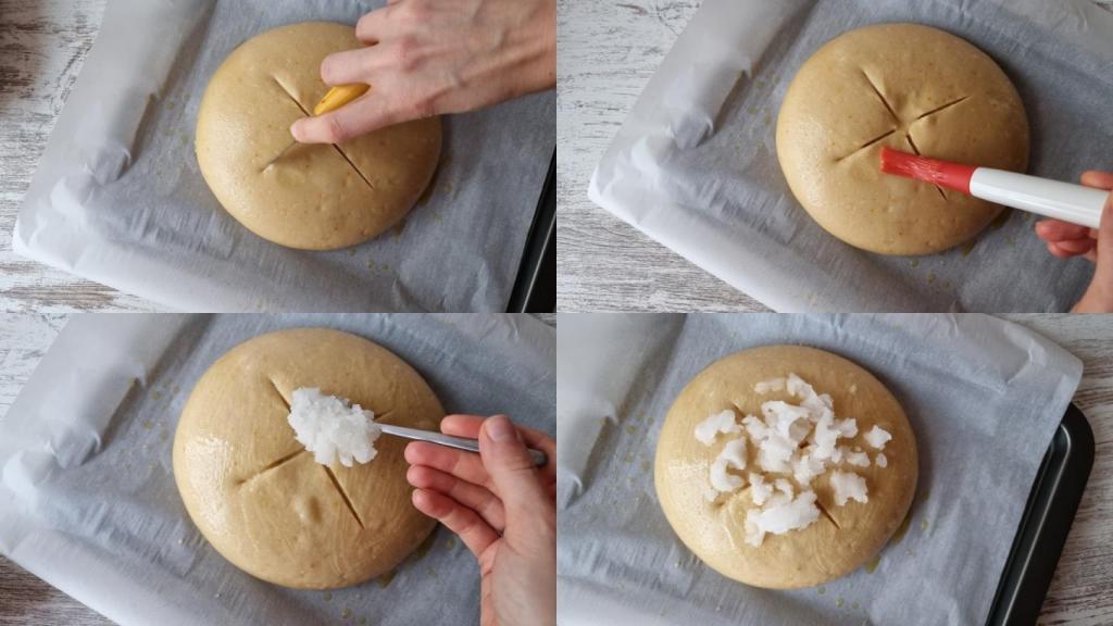 Cuando haya vuelto a doblar su tamaño, hacer una cruz en la superficie con la ayuda de una cuchilla o un cúter bien afilado y pintar con huevo batido. Colocar por encima el azúcar húmedo que hemos preparado. Hornear a 190 ºC durante 30 minutos.