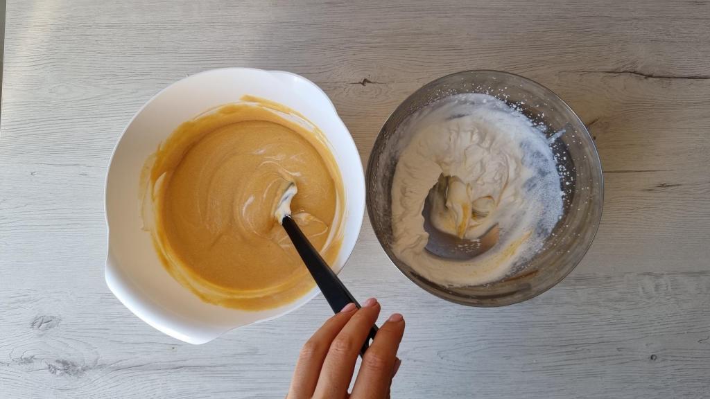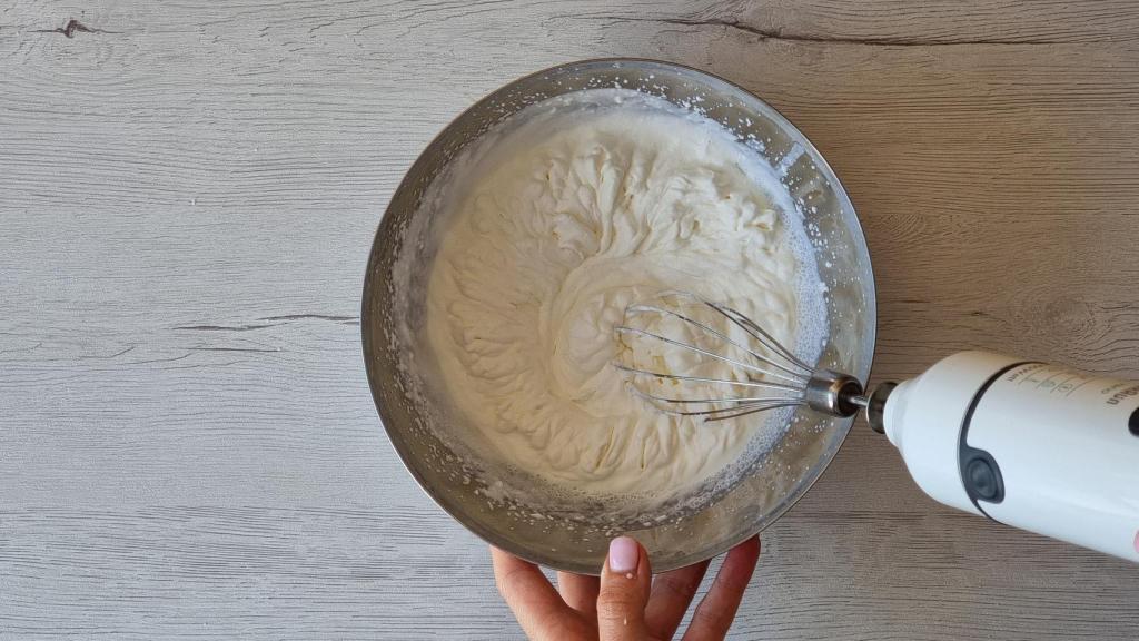 Con la nata para montar muy fría ponerla en un bol, frío también (es recomendable meterlo en la nevera), y montar hasta que esté bien densa con la ayuda de unas varillas. El punto perfecto será cuando le demos la vuelta al bol y la nata se quede firme, no caiga. Cuidado con no pasarnos porque si batimos de más la nata se convertirá en mantequilla y no habrá vuelta atrás.