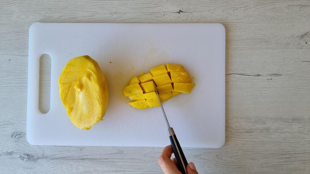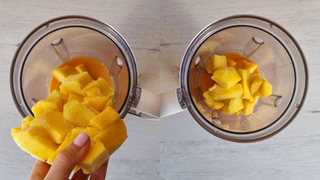 Pelar el mango y cortarlo en cuadraditos quitando el hueso central. Congelar esos cuadraditos completamente durante, al menos, 12 horas.