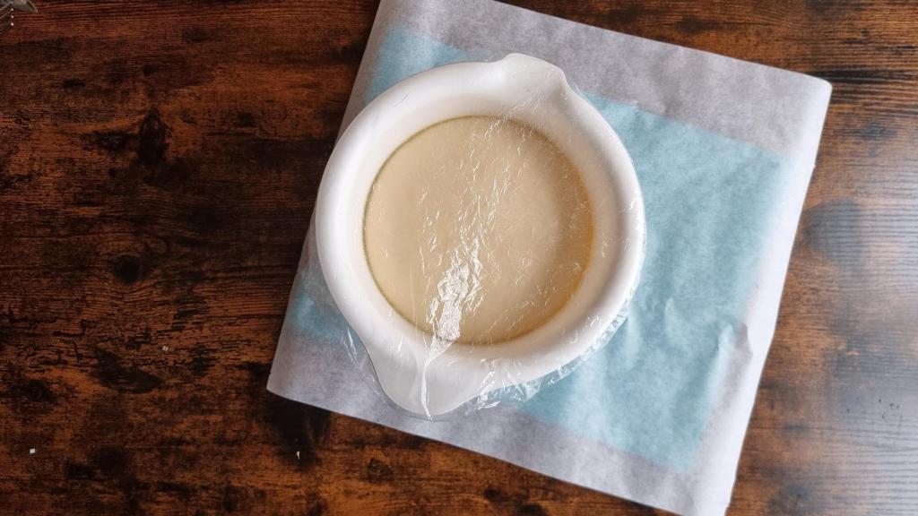 Lo primero será hacer el prefermento y, para ello, mezclaremos la harina de fuerza con el agua a temperatura ambiente y la levadura hasta conseguir una masa dura. La colocaremos en una tartera o bol, tapado, y dejaremos fermentar 8 horas en la nevera. Crecerá mucho así que ponedla en un bol grande.