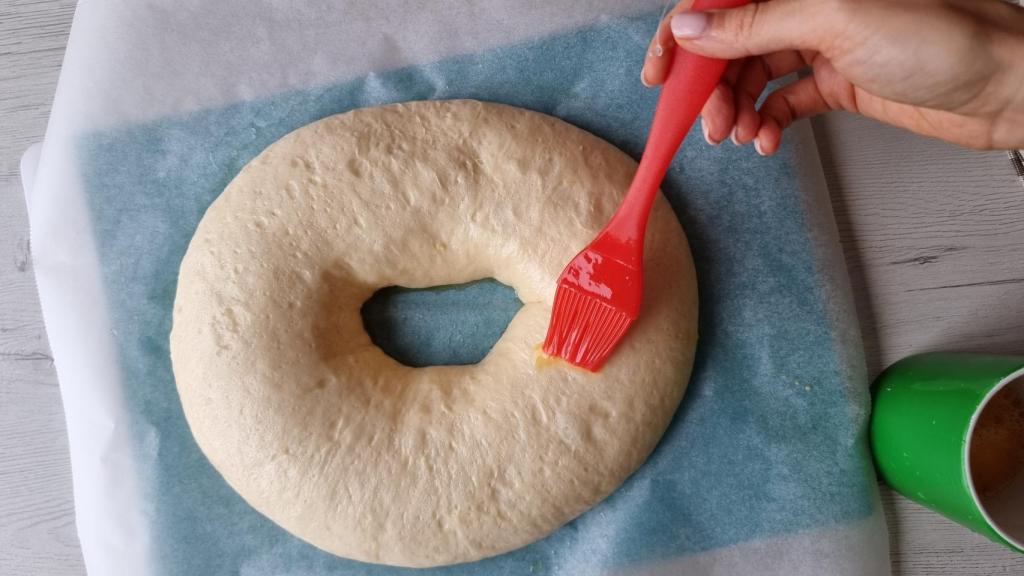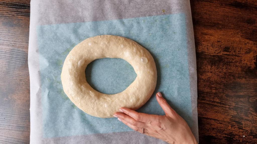 Tras este tiempo, volcar la masa en una superficie aceitada, cortar por la mitad con cuidado de no machacar mucho la masa y formar dos bolas con cada parte de la masa. Meter los dedos en el centro de la bola y estirar hasta conseguir hacer la rosca del roscón, con un agujero grande en el medio. El agujero tiene que ser grande porque la masa va a fermentar de nuevo y, si no, se cerraría. Tapar con papel film, no muy apretado, sino sólo superpuesto, y dejar fermentar otra vez unas dos horas, hasta que doble el volumen.