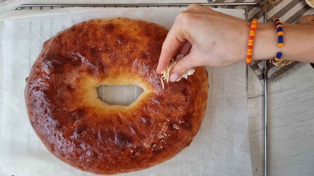 Cuando el roscón ya esté frío, pincelar con un poco del almíbar de la naranja confitada (o un poco de miel disuelta con unas gotas de agua) y decorar con azúcar mojado con agua de azahar, con las almendras y la naranja.