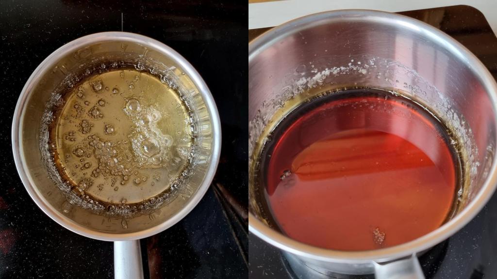 Lo primero que hay que hacer es el caramelo y, para ello, hay que tener mucho cuidado porque sus altas temperaturas nos pueden jugar una mala pasada. No hay peor quemadura que la del caramelo. Lo mejor será poner el agua, el azúcar y el zumo de limón en un cacillo y esperar a que caramelice a fuego medio, nunca muy alto porque correríamos el riesgo de que se quemara. Y el caramelo quemado amarga muchísimo.