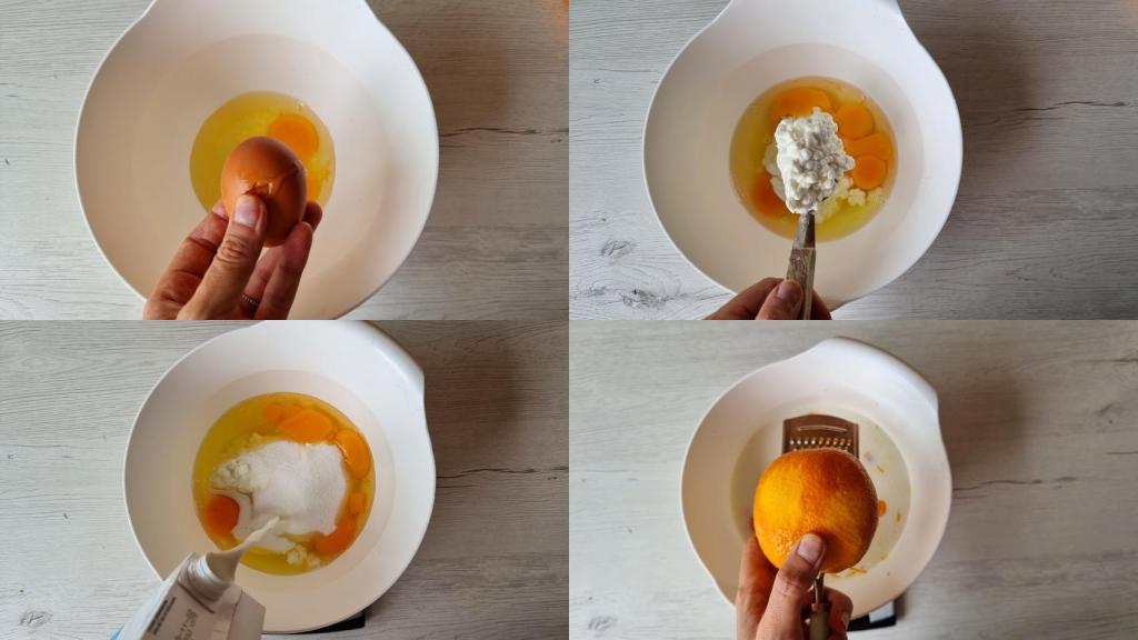 En un bol, cascar los huevos, añadir el azúcar, el queso cottage, la leche y la ralladura de naranja. Cuidado porque la ralladura de naranja es muy persistente y si nos pasamos podrá ser demasiado invasiva.