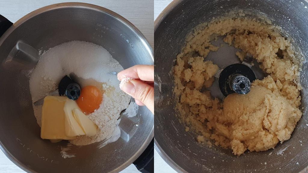 Precalentar el horno a 190 ºC. En un robot de cocina, mezclar todos los ingredientes de la galleta, triturando lo suficiente hasta que esté todo mezclado y la masa se vaya quedando como una bola. Retirar la masa de ahí y hacer una bola con las manos.