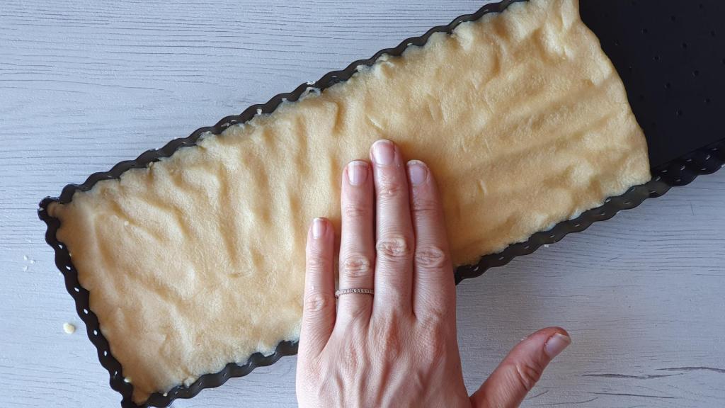 Estirar la masa sobre el molde haciendo una capa lo más uniforme posible. Llevar al congelador 15 minutos. Tras este tiempo, hornear durante 20 minutos o hasta que esté la masa dorada. Retirar del horno y dejar enfriar completamente.