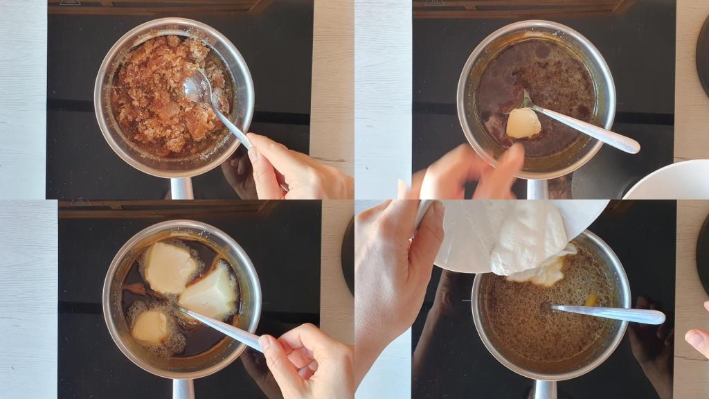Inmediatamente añadir la mantequilla, la mezcla empezará a burbujear violentamente, no pasa nada. Remover con constancia hasta que todo se integre. Por último, agregar la nata y seguir mezclando bien. Agregar también la sal al punto deseado. Dejar atemperar.