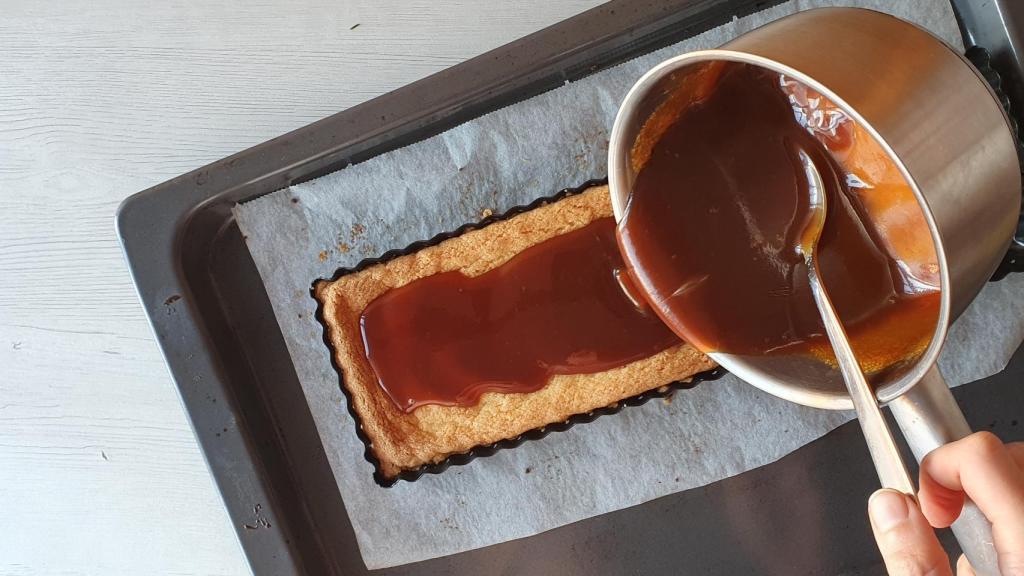 Cuando el toffee ya esté templado, verter sobre la masa y llevar a la nevera durante toda la noche.