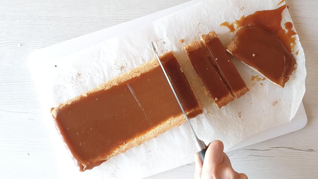 Galleta crujiente planteada a caballo entre un sablé bretón y una masa quebrada, una capa de toffee meloso con un punto de sal por encima y, como colofón, una cobertura de chocolate por encima, del grosor que cada uno quiera para que sea más o menos predominante. ¿No es una tentación?