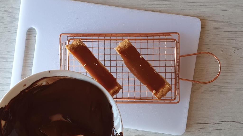 Añadir el chocolate por encima de las barritas, poniéndolas sobre una rejilla. Extender muy bien y dejar enfriar completamente.