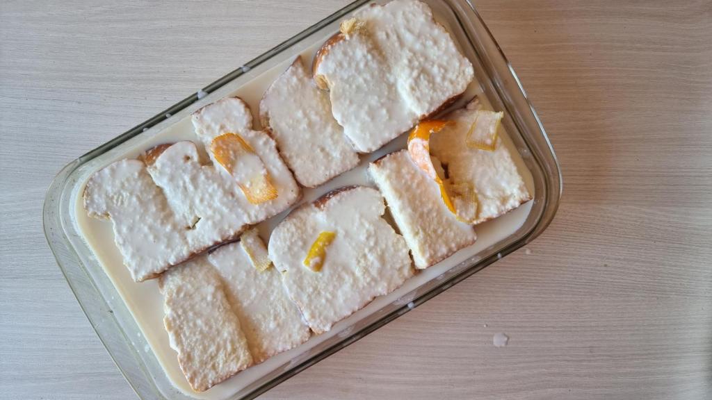 Cortar el pan de brioche con las siguientes medidas; 5 cm de alto, 10 cm de largo y 3 cm ancho aproximadamente. En una bandeja honda rectangular, colocar el pan pegado a otro. El bollo tiene que ser aéreo y sin mucha corteza.