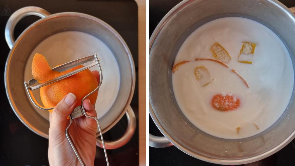 En una olla, disponer la leche, la nata, azúcar, canela en polvo, piel de naranja y piel de limón (sin la parte blanca para que no amargue). Llevar a ebullición y dejar infusionar 5 minutos. Es importante utilizar canela en polvo para obtener el máximo rendimiento y tener siempre el mismo aroma siempre.