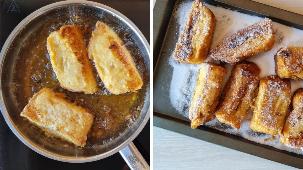 Freír las torrijas en aceite a 160 ºC por los dos lados. Se debe utilizar aceite de girasol y no muy fuerte para obtener una fritura suave y que no queden muchos hilos al freír, quedando todas las partes doradas por igual. Escurrirlas sobre un papel y pasar por azúcar y canela.