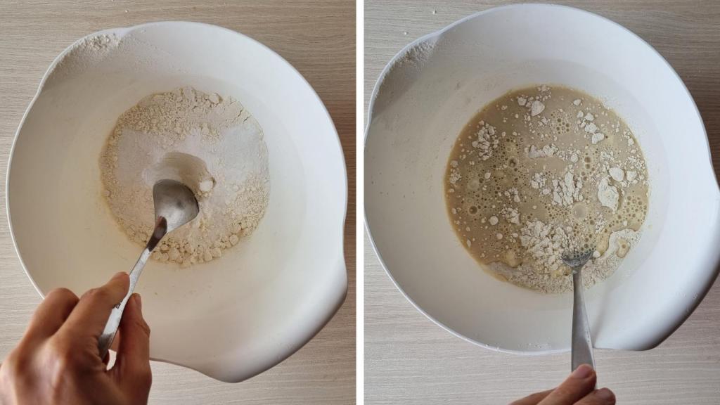 Mezclar en un bol los ingredientes secos, habiendo tamizado previamente la harina para que quede bien fina. Después, añadir los ingredientes húmedos y mezclar todo bien sin batir en exceso. Uno de los secretos de las tortitas es no pasarse con este batido de ingredientes para que que queden unas tortitas jugosas.
