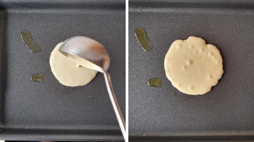 Calentar una plancha o sartén y añadir unas gotas de aceite, untándolo bien. Y cuando esté bien caliente, añadir una porción de masa de tortitas con la ayuda de una jarra o de un cucharón.