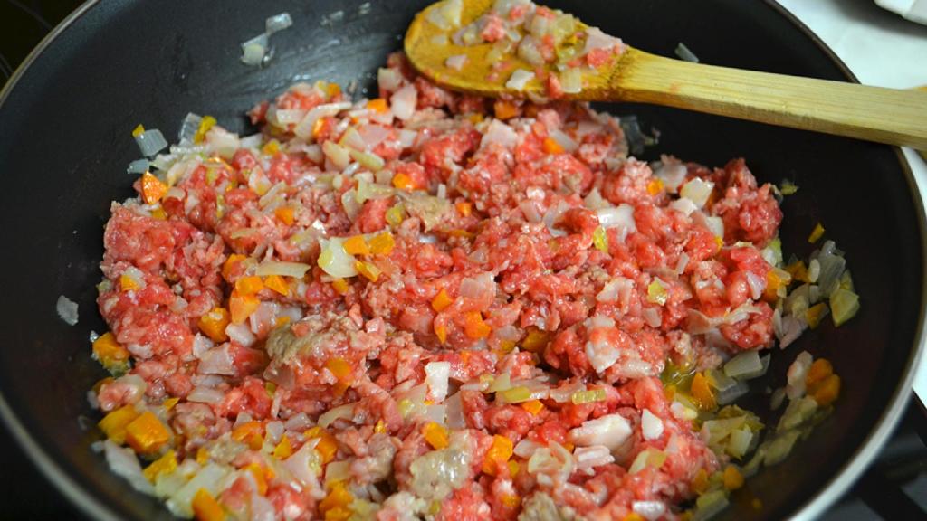 Añadimos la carne picada y la panceta cortada muy fina, salteamos las carnes hasta que se empiecen a dorar, añadimos el vino blanco, subimos el fuego y dejamos que hierva durante unos minutos hasta que se evapore el alcohol.