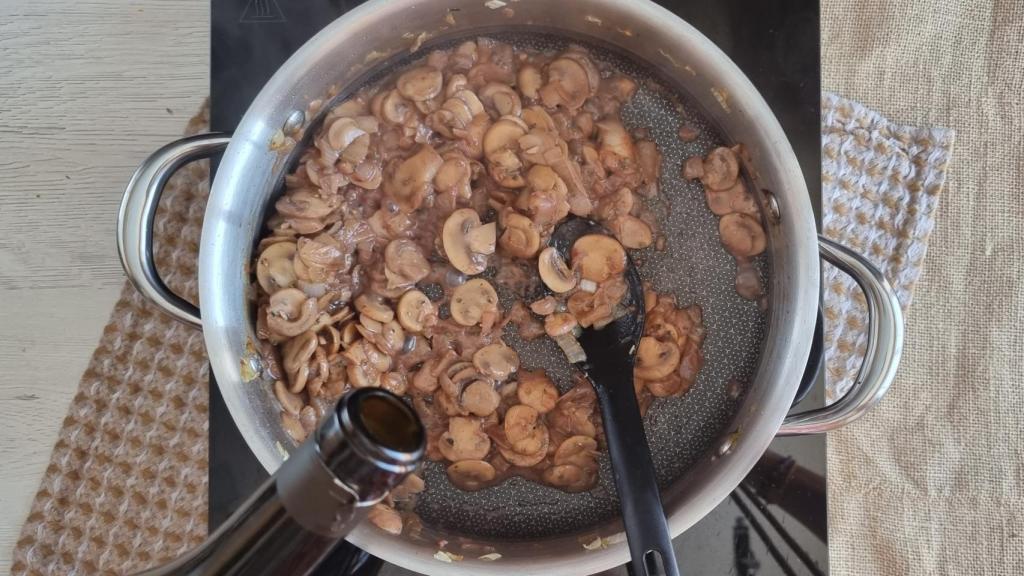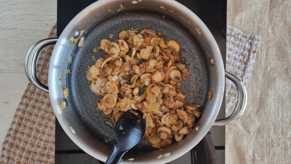 Cuando la cebolla ya esté muy bien pochada, añadir también los champiñones laminados bien escurridos y rehogar durante unos 10 minutos o hasta que estén muy tiernos y cojan color.