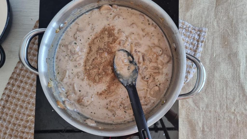 Entonces, bajar el fuego y agregar la nata, mezclar todo bien y esperar a que rompa el hervor. Dejar cocinando a fuego mínimo durante unos 10 minutos, removiendo de vez en cuando. Poner a punto de sal y poner el polvo de setas deshidratadas que dará un golpe de sabor importante a la salsa. Mezclar muy bien.
