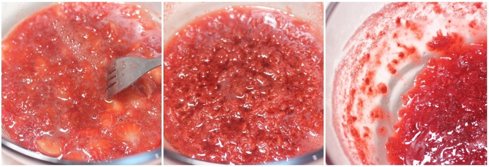Calentamos en el microondas durante 3 minutos a 800 W en tandas de 1 minuto y removiendo con una cuchara entre tanda y tanda. La imagen superior muestra el aspecto de la fruta después de cada “calentón” de 1 minuto.