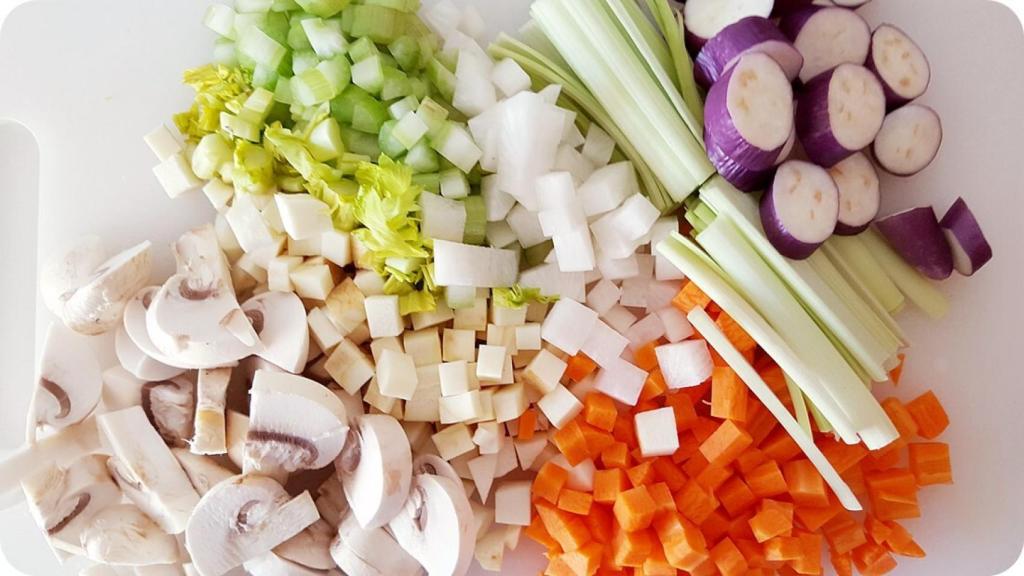 Empezamos lavando, pelando y troceando las verduras en dados pequeños, rodajitas o bastones, pero procurando que el grosor sea similar.