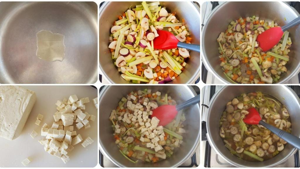 En una olla o un cazo ponemos a calentar el aceite y rehogamos las verduras durante unos 5 minutos a fuego medio, añadimos el tofu cortado en dados, mezclamos y agregamos el agua. Llevamos a ebullición y cocinamos hasta que las verduras estén tiernas a nuestro gusto. Yo lo dejo escasos 10 minutos porque me gustan al dente.