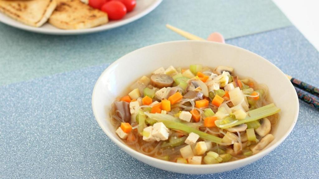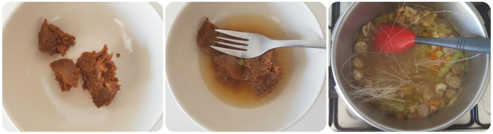 En un bol aparte ponemos el miso, añadimos 2 o 3 cucharadas del caldo de las verduras y lo disolvemos bien. Apagamos el fuego, añadimos el miso disuelto a la olla, mezclamos bien y echamos los fideos vermicelli, dejamos reposar 3 minutos para que se hidraten y servimos.