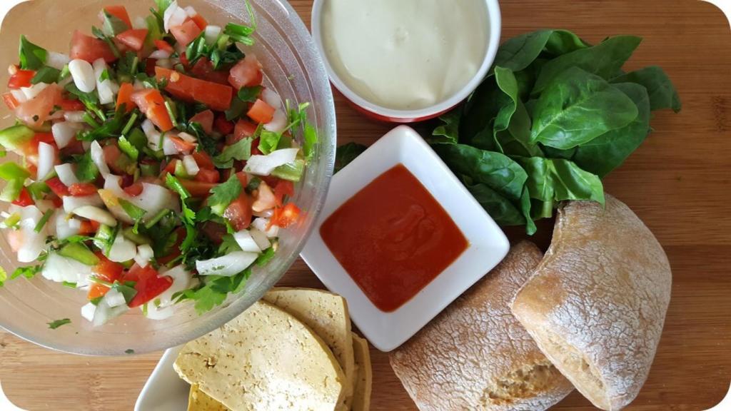 6. Untamos la otra mitad de los panes con la veganesa de almendra y tapamos.