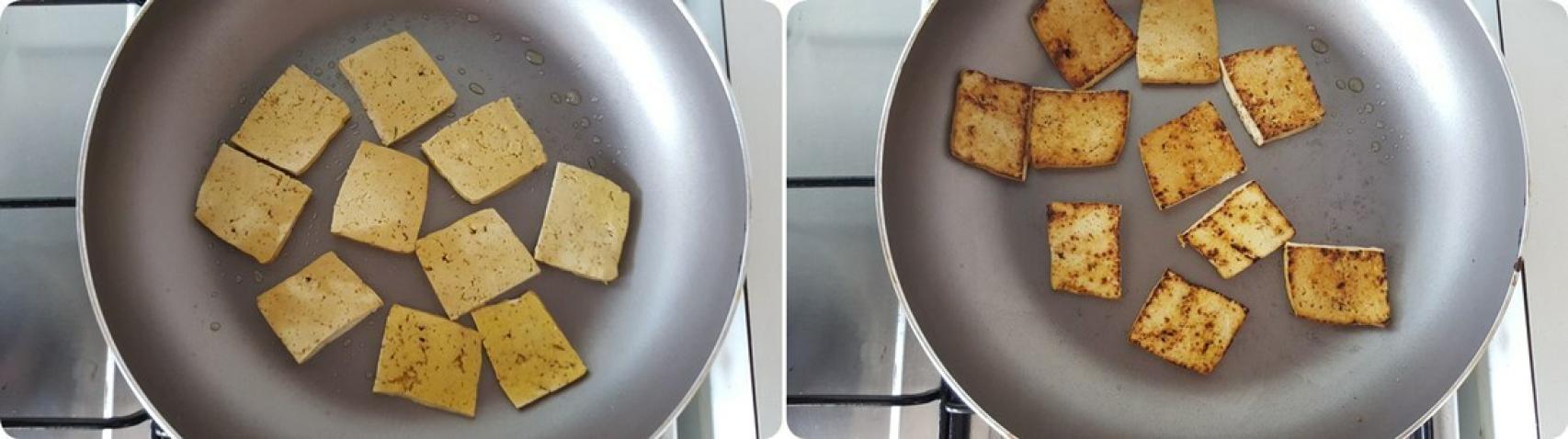 Cocinamos el tofu a la plancha en una sartén a fuego alto. Con menos de dos minutos por cada lado será suficiente para que se dore. Reservamos.