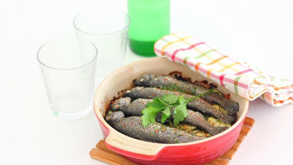 En esta ocasión la he preparado con truchitas, porque eran tan pequeñas que una sola no daba para una ración, pero si usáis truchas de ración simplemente tendréis que aumentar unos minutos el tiempo en el horno.