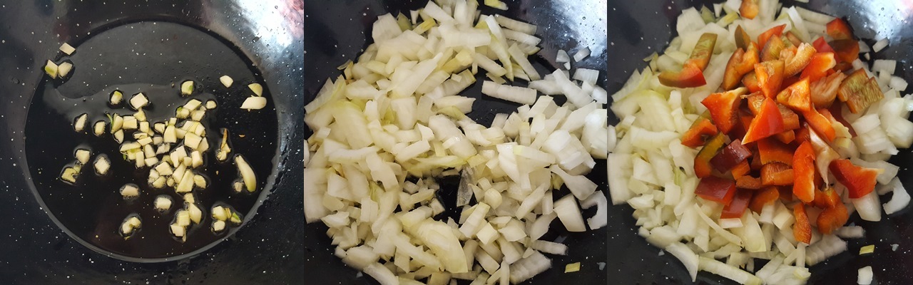 En una cazuela sofreímos el ajo, la cebolla y el pimiento una pizca de sal, a fuego medio y removiendo de vez en cuando hasta que estén tiernos.
