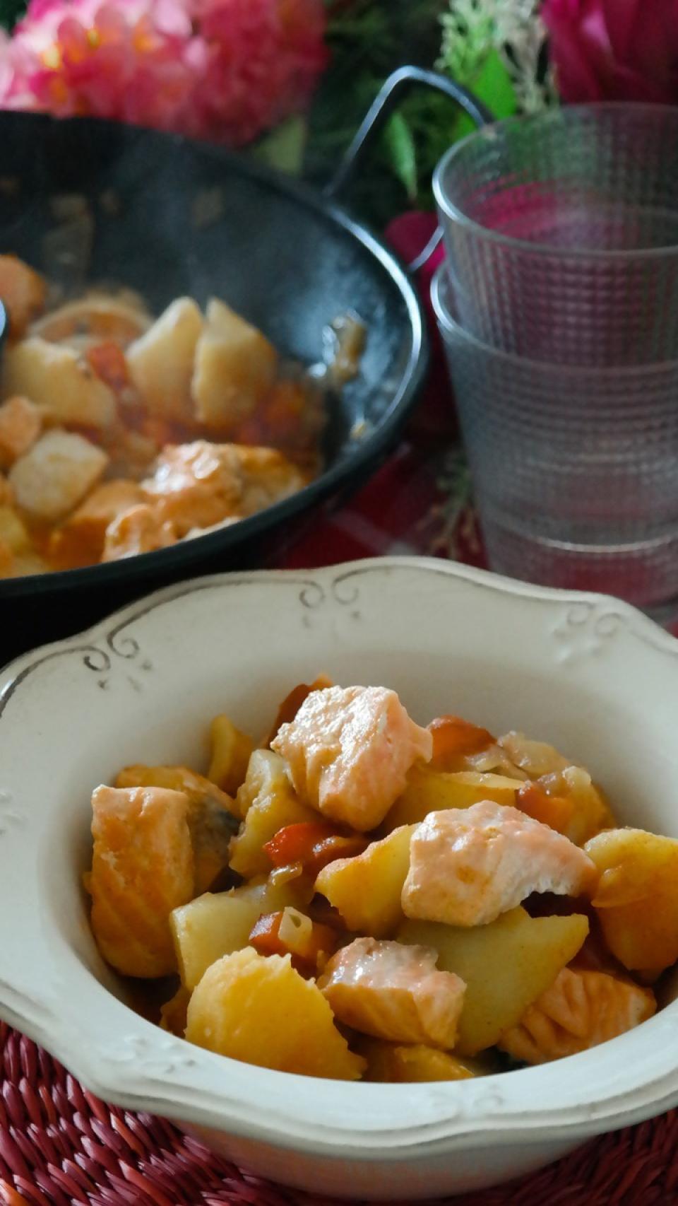 Aunque el marmitako original suele llevar pimiento choricero, vino blanco y tomate que le dan un punto ligeramente ácido al guiso y que le va muy bien al plato tradicional con bonito, en el caso del salmón, como tiene un sabor menos intenso, no son necesarios, de hecho, en mi humilde opinión queda mejor sin esos dos ingredientes.