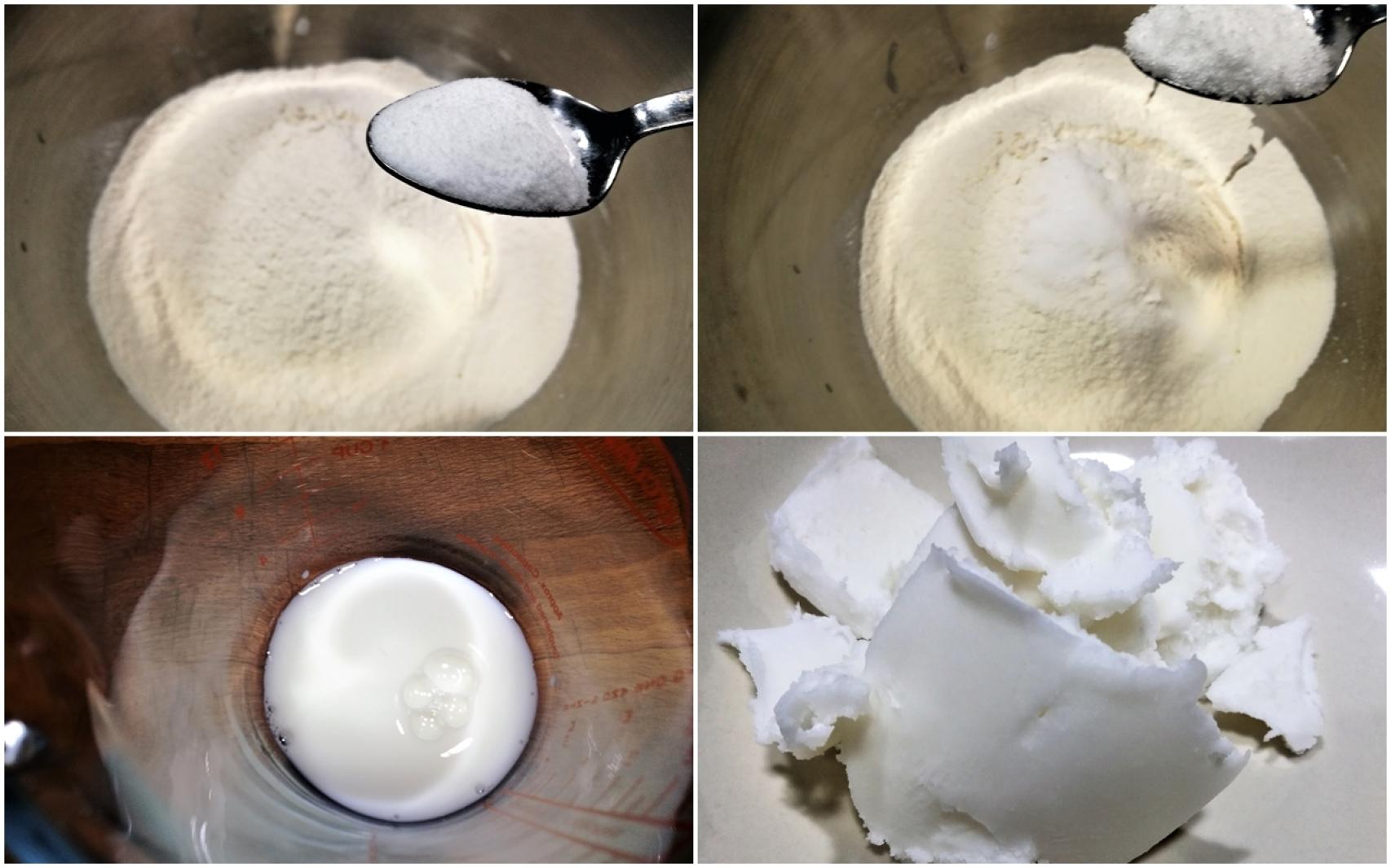01: Preparamos y pesamos los ingredientes de la masa, juntando los secos y los líquidos entre ellos