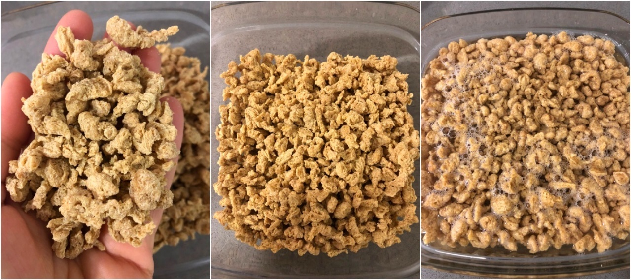 Antes de empezar a preparar nuestros tacos veganos es muy importante realizar este paso previo; hidratar la soja texturizada. Esta se comercializa en seco y para poderla consumir debemos hidratarla. La pondremos en un bol o plato hondo y la cubriremos con agua.