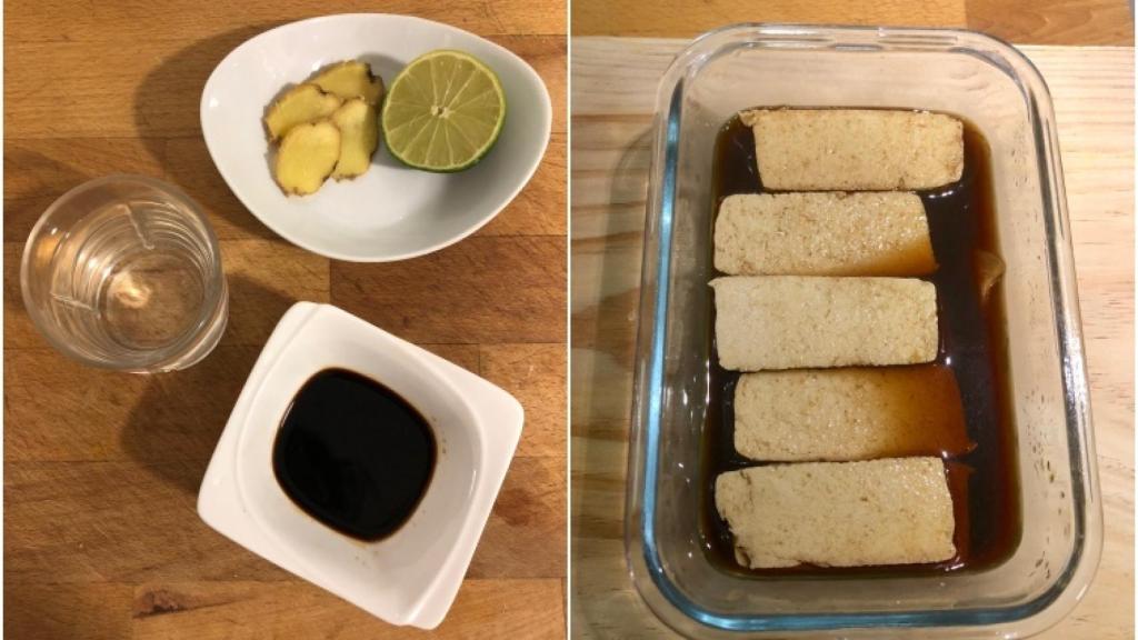Pasadas las 18-24h podemos sacar el tofu de la nevera y preparar el envoltorio.