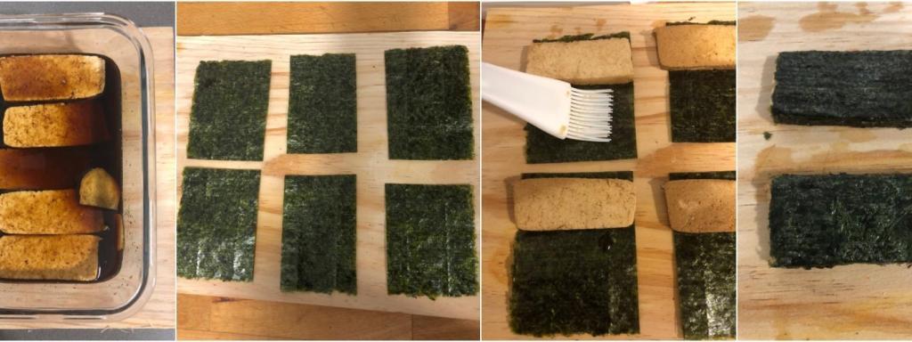 Una vez cortada el alga nori, pondremos un trozo de nuestro tofu marinado encima de la porción de alga nori y, con la ayuda de un pincel, mojaremos un poquito el alga nori con el marinado que hemos utilizado para el tofu. Esto nos ayudará a que quede bien adherida el alga nori al tofu y que cuando lo cocinemos no se nos despegue. Una vez impregnada el alga, enrollaremos en tofu con el alga nori.